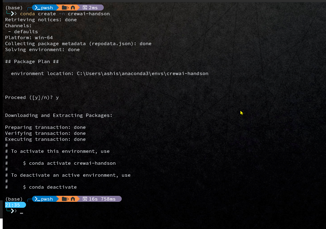 Give commandconda create -n crewai-handsonto create new environment calledcrewai-handson