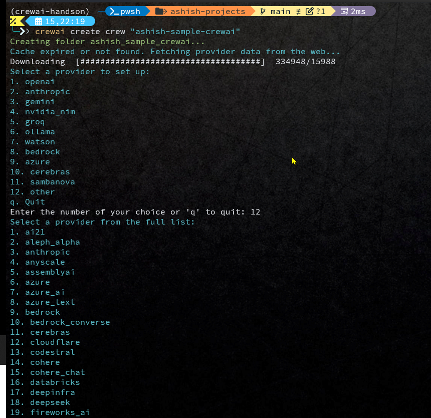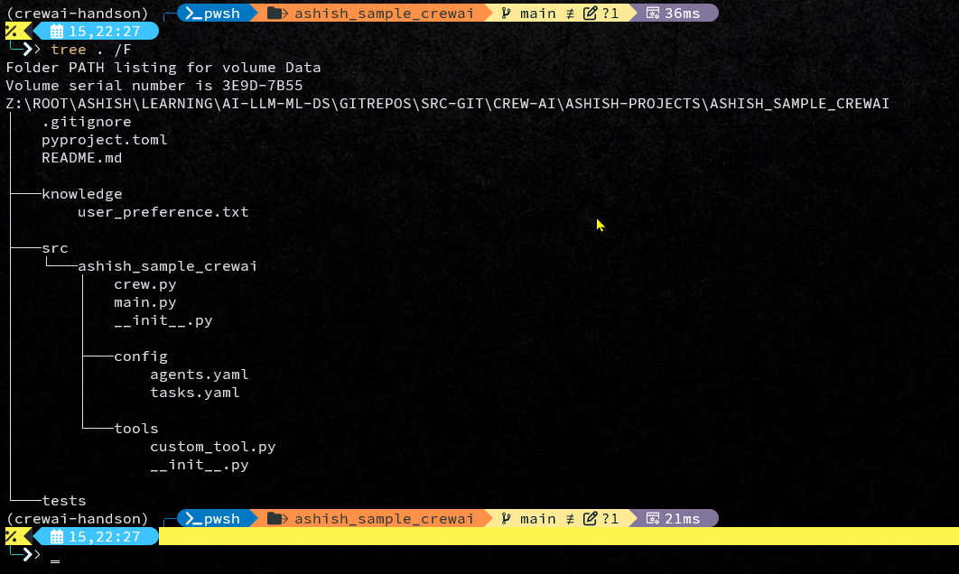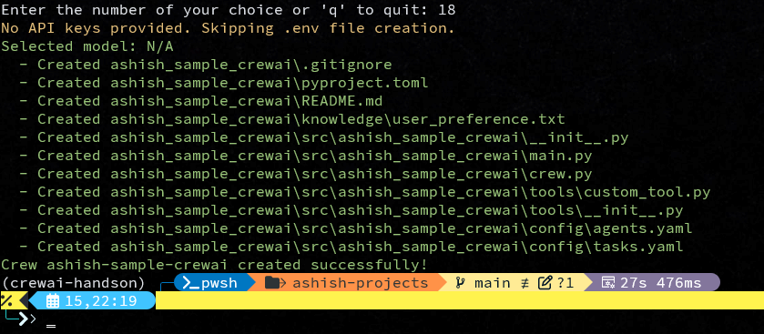 You can run the command -crewai create crew "ashish-sample-crewai"and it will create a crewai project nameashish-sample-crewaiand with all the basic skeleton code or boilerplat code withhin it.
